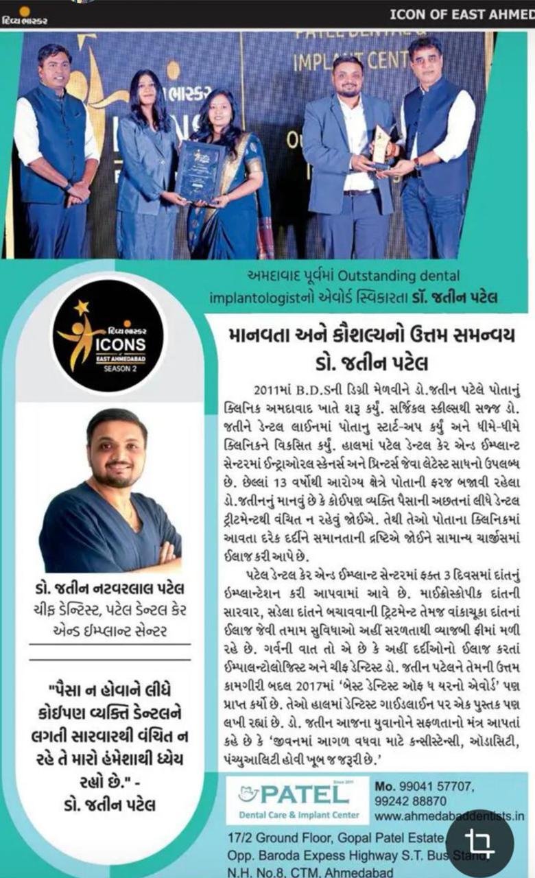 I was suffering from pain and pus discharge in my gums .then I visited patem dental clinic at ctm .doctors nicely expian whole procedures and nicely doing my treatment. Well equipped dental clinic and hygiene is very good. Must visit hear for any dental treatment. Best clinic and best doctor in ahmdabad